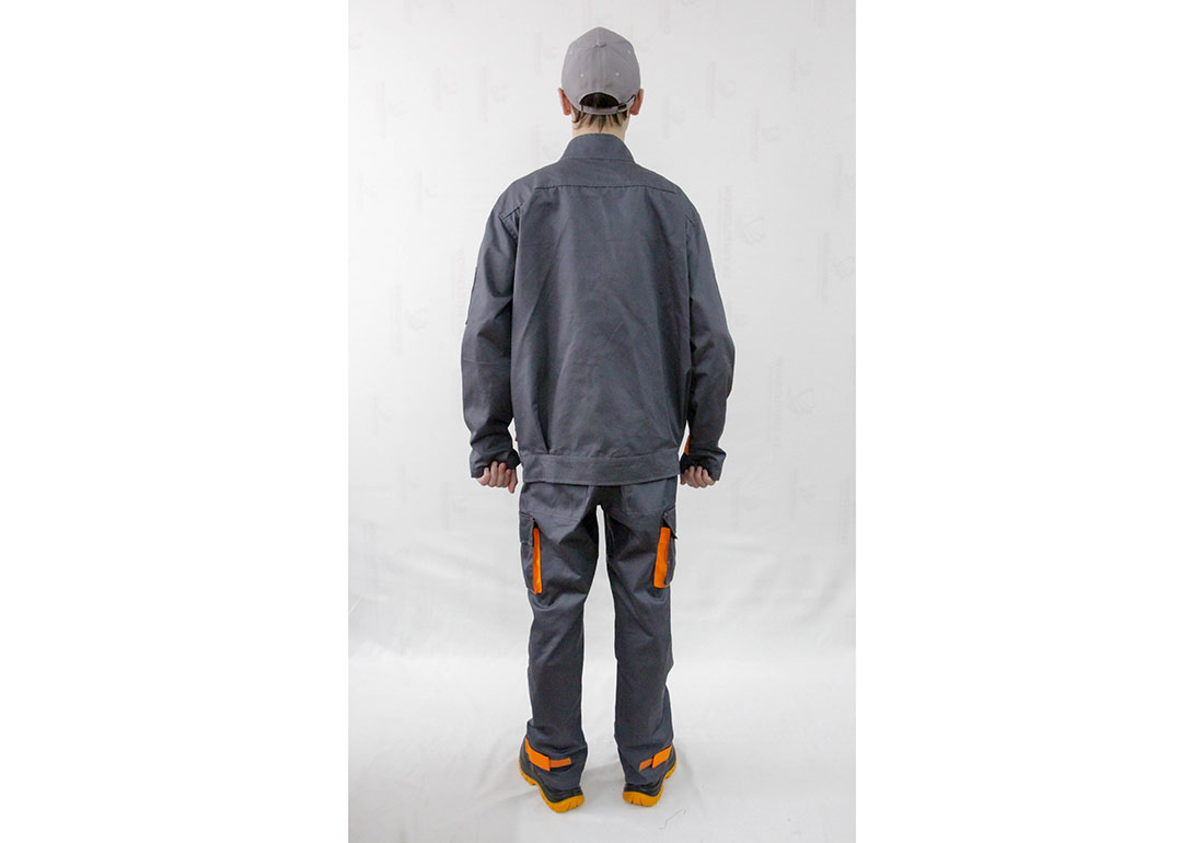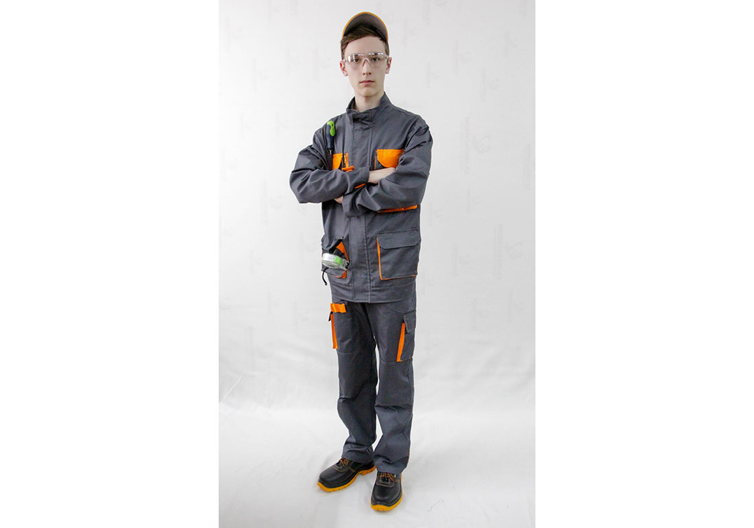 Костюм выполнен из ткани серого цвета с яркой оранжевой отделкой.