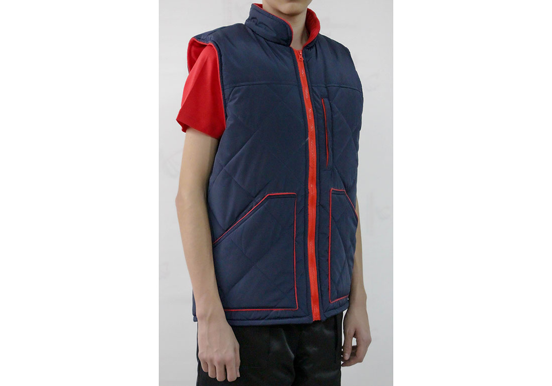 Жилет стёганный на флисе. Воротник стойка. Центральная бортовая застёжка «молния». 1 верхний прорезной карман на «молнии», 2 нижних накладный кармана утеплённых флисом.
