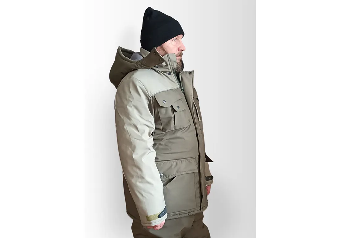 Карманы: 2 верхних накладных на кнопках, 2 нижних сложных с клапаном на кнопке, 2 внутренних на липучке. Светооражающий кант по кокетке на груди и спине, рукавам и капюшоне.