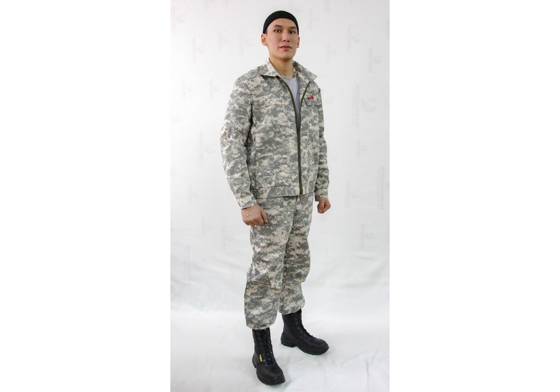 Тк. «Рип-Стоп», ВО, 65% п/э., 35% х/б, 210 г./м2. Куртка короткая, с отложным воротником, с центральной бортовой застежкой на тракторную молнию; с притачным поясом частично стянутым резинкой; с нагрудными карманами и клапанами на липучках, с боковыми карманами в вертикальных швах. Рукава, с манжетами на пуговицах. Брюки с притачным поясом, застегивающимся на пуговицу; с 5 шлевками и эластичной тесьмой по боковым швам брюк; с застежкой гульфика на три петли и пуговицы; с двумя накладными боковыми карманами с наклонным входом. ГОСТ 12.4.280-2014