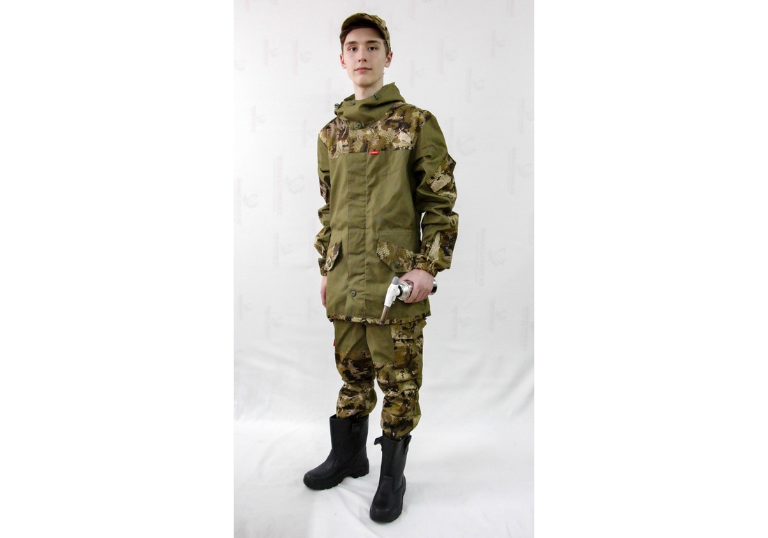 Куртка: удлинённая прямого кроя, супатная застёжка на пуговицах, усиленные накладки, прорезные карманы листочка с клапанами на пуговицах, внутренний карман, втачной капюшон с козырьком, по талии стянута резинкой, по низу регулируется шнуром. На рукавах полуобъёмные карманы с клапанами на липучке, манжет стянут резинкой.