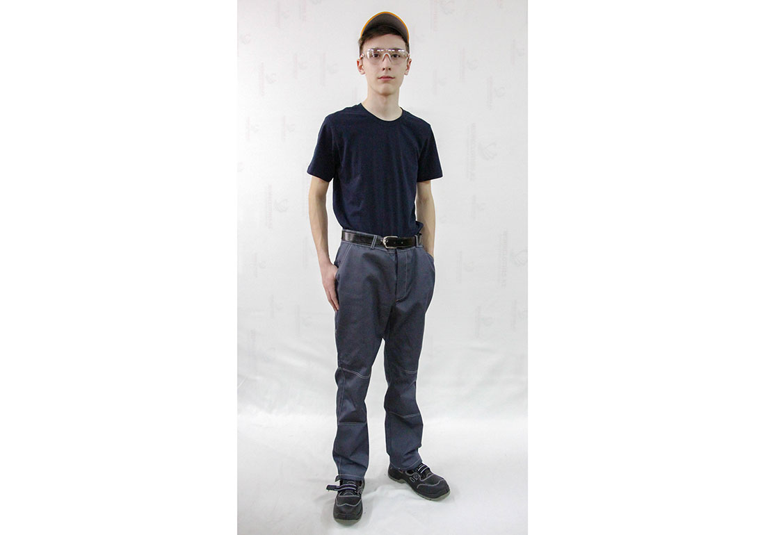 Брюки прямые, по переду накладные карманы. Гульфик на молнии.