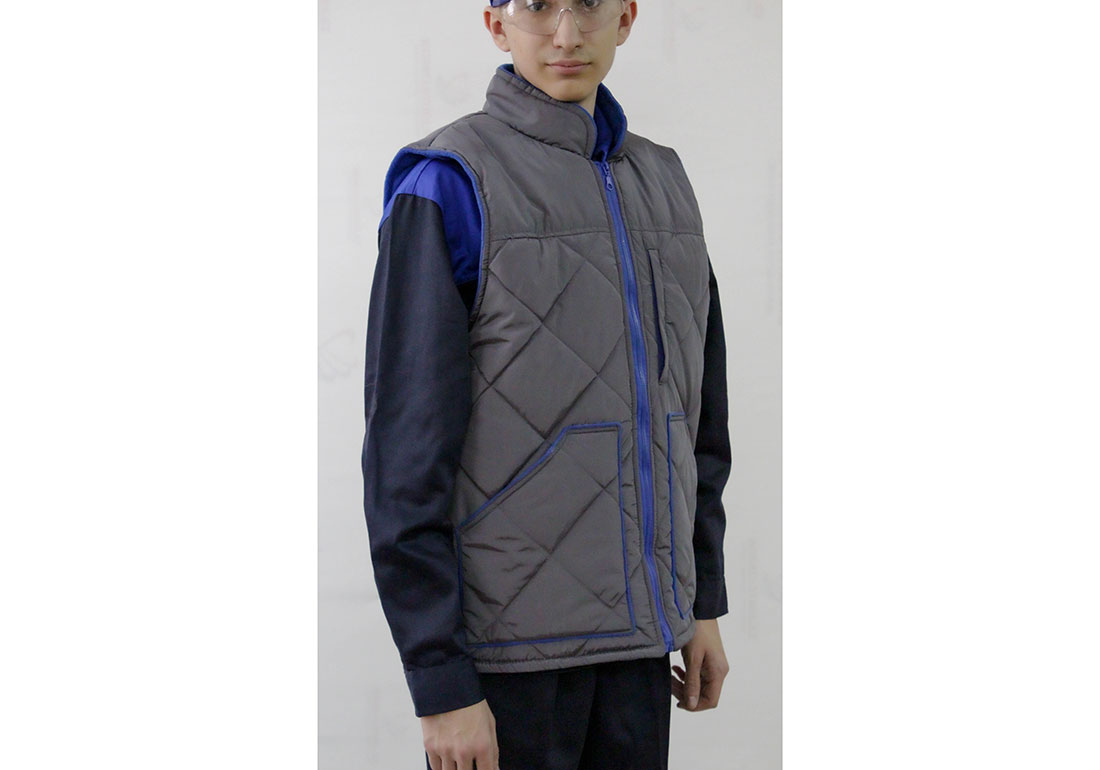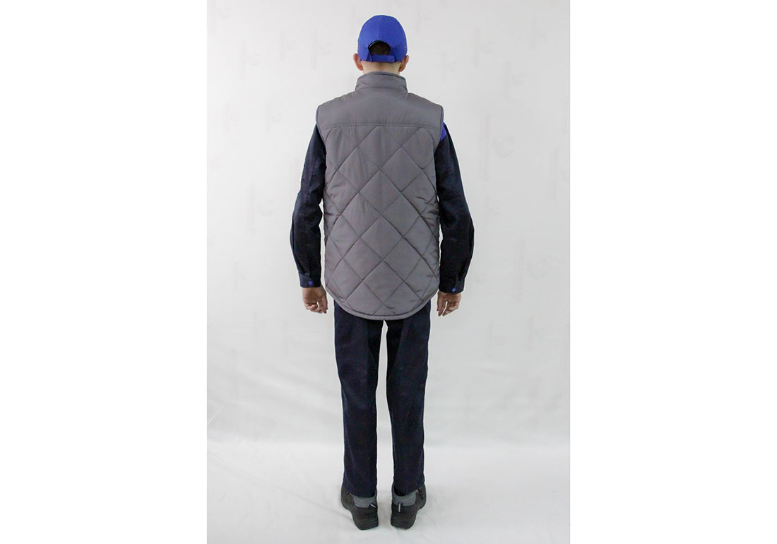 Жилет стёганный на флисе. Воротник стойка. Центральная бортовая застёжка «молния». 1 верхний прорезной карман на «молнии», 2 нижних накладный кармана утеплённых флисом.