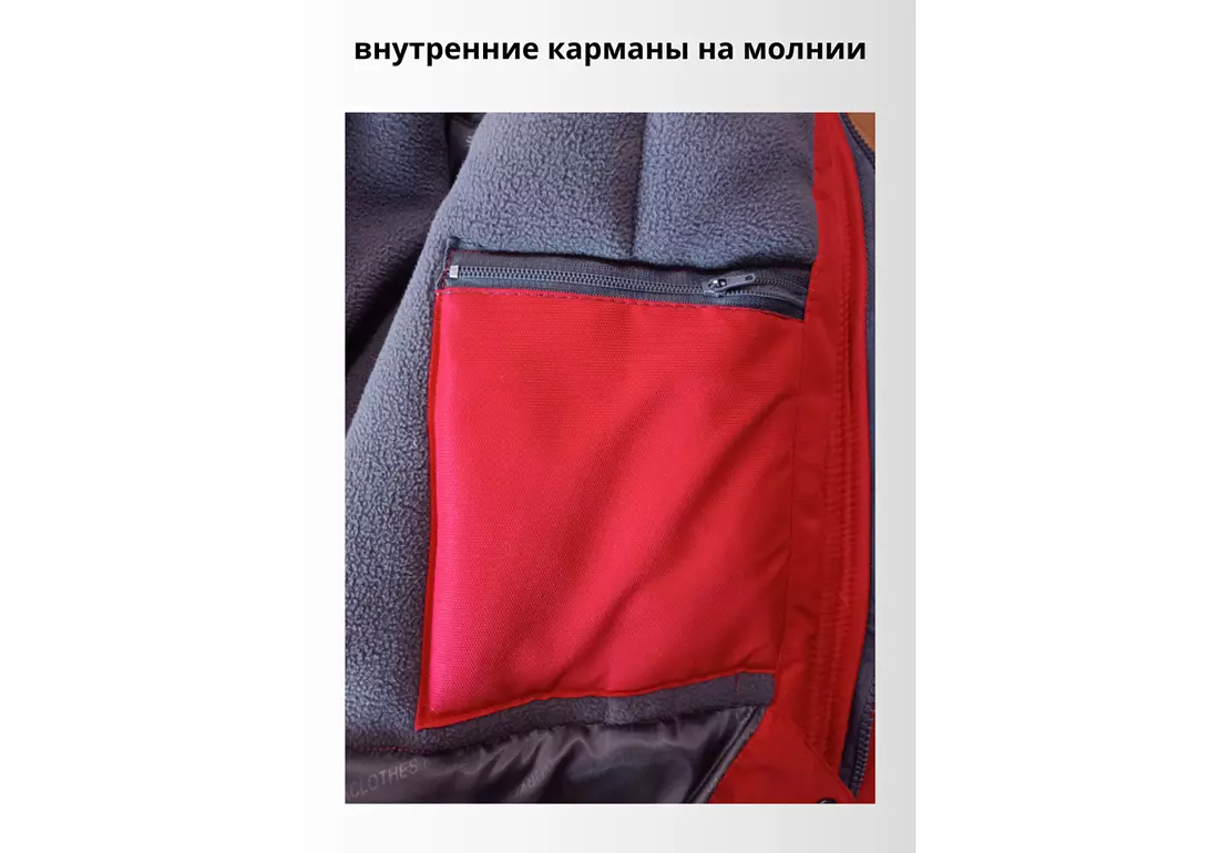 Карманы на куртке: 2 нагрудных с косым входом, 2 нижних сложных с клапаном на кнопках, 2 внутренних на молнии.